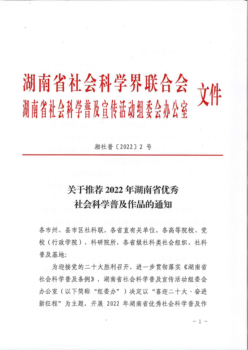 关于推荐2022年湖南省优秀社会科学普及作品的通知
